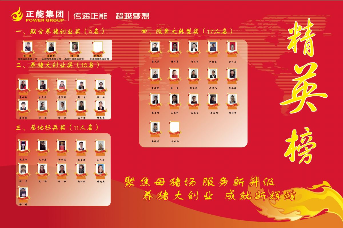 頒發(fā)了正能集團(tuán)2016年度“基地標(biāo)兵獎(jiǎng)11人”、“養(yǎng)豬大創(chuàng)業(yè)獎(jiǎng)10人”、“服務(wù)大轉(zhuǎn)型獎(jiǎng)17人”、“聯(lián)合養(yǎng)豬創(chuàng)業(yè)獎(jiǎng)4人”、創(chuàng)業(yè)英雄團(tuán)隊(duì)獎(jiǎng)13個(gè)。個(gè)人獎(jiǎng)項(xiàng)共計(jì)42個(gè),每位獲獎(jiǎng)英雄頒發(fā)了由正能集團(tuán)精心打造的100g純銀銀質(zhì)英雄獎(jiǎng)?wù)乱幻丁F(tuán)隊(duì)獎(jiǎng)13個(gè),頒發(fā)了創(chuàng)業(yè)英雄團(tuán)隊(duì)獎(jiǎng)牌并給予2000元活動(dòng)基金獎(jiǎng)勵(lì)。