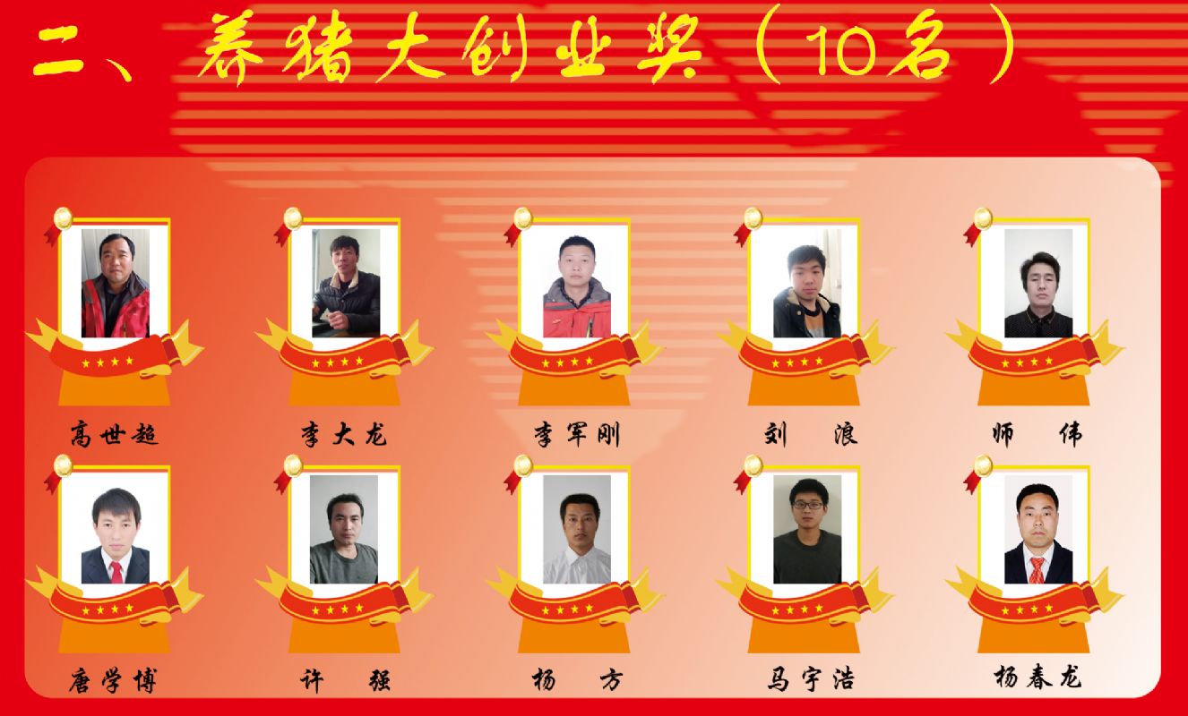 咸陽(yáng)正能養(yǎng)殖公司: 劉 體 “養(yǎng)豬大創(chuàng)業(yè)獎(jiǎng)” 10名 榆林正輝養(yǎng)殖有限公司 李軍剛 隴東事業(yè)部服務(wù)專員 唐學(xué)博 寶雞坪頭豬場(chǎng) 楊 方 商洛柞水豬場(chǎng) 李大龍 咸陽(yáng)渭濱豬場(chǎng) 高世超 咸陽(yáng)事業(yè)部技術(shù)服務(wù) 許強(qiáng) 劉浪