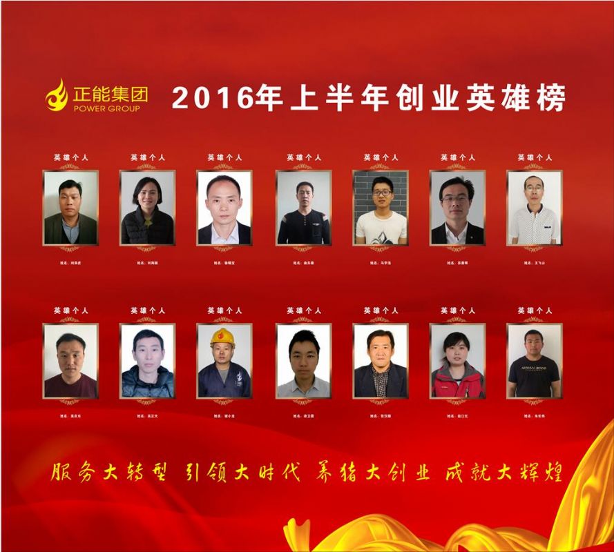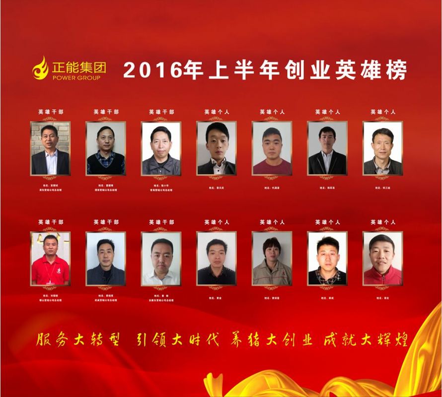 2016年7月19日晚19:00-21:00,“正能集團(tuán)股權(quán)轉(zhuǎn)讓儀式暨2016年上半年創(chuàng)業(yè)英雄頒獎(jiǎng)晚會(huì)”在西北革命圣地-銅川照金隆重舉行。今夜的照金賓館五樓會(huì)議廳華燈璀璨、高朋滿座,正能集團(tuán)總裁王義輝、集團(tuán)產(chǎn)品技術(shù)總監(jiān)連星、財(cái)務(wù)總監(jiān)朱武寧、高陵基地總經(jīng)理白萬(wàn)禮、渭南、西安、咸陽(yáng)、甘肅、山西、隴東等事業(yè)部、營(yíng)銷公司總經(jīng)理出席晚會(huì)。正能創(chuàng)業(yè)英雄戰(zhàn)將共計(jì)100余人參加本次晚會(huì)。本次大會(huì)以“服務(wù)大轉(zhuǎn)型、引領(lǐng)大時(shí)代、養(yǎng)豬大創(chuàng)業(yè)、成就大輝煌”為主題,以開闊的視野、創(chuàng)新的形勢(shì),引爆巨大能量場(chǎng),聚英雄氣概,展團(tuán)隊(duì)風(fēng)采,亮大帥風(fēng)姿,迸發(fā)激情,總結(jié)2016上半年輝煌成就,斗志昂揚(yáng),展望2016下半年宏偉藍(lán)圖。 獎(jiǎng)項(xiàng)設(shè)置:英雄個(gè)人:100G純銀打造的正能英雄獎(jiǎng)?wù)?共22人。 英雄干部:100G純銀打造的正能英雄獎(jiǎng)?wù)?共6人。